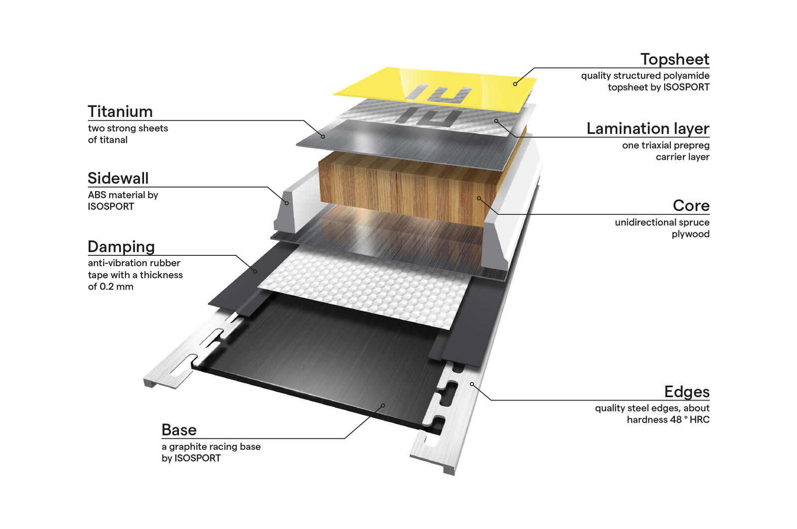 | Více info | delší rocker ve špičce i patce sintrovaná skluznice ocelové hrany jádro ze smrkové a bukové překližky 2 tenčí titanalové pláty dvoubarevné lepené bočnice z ABS laminační vrstva vrchní strukturovaná folie |