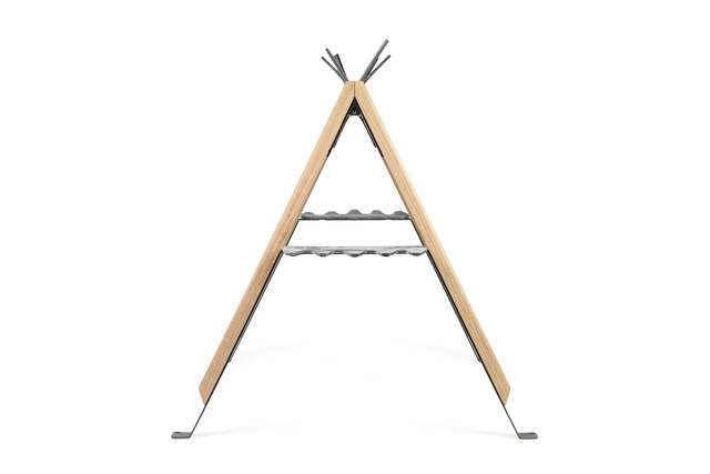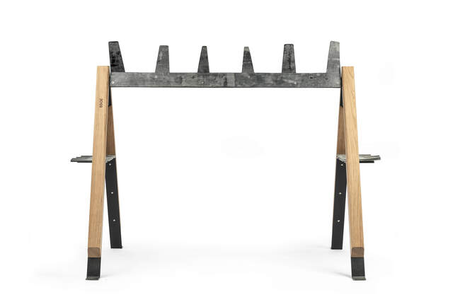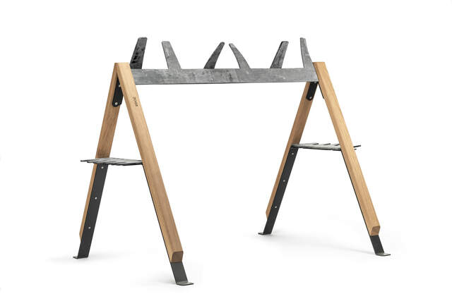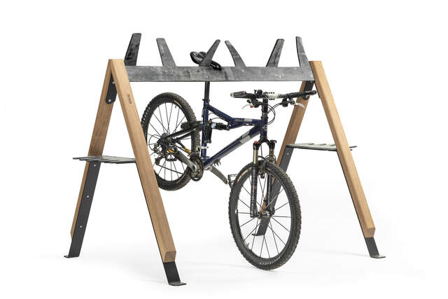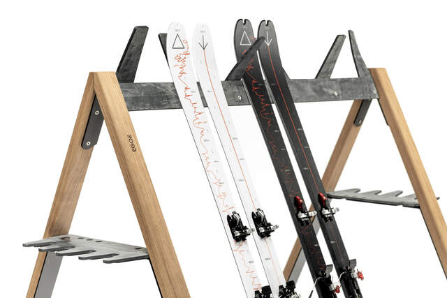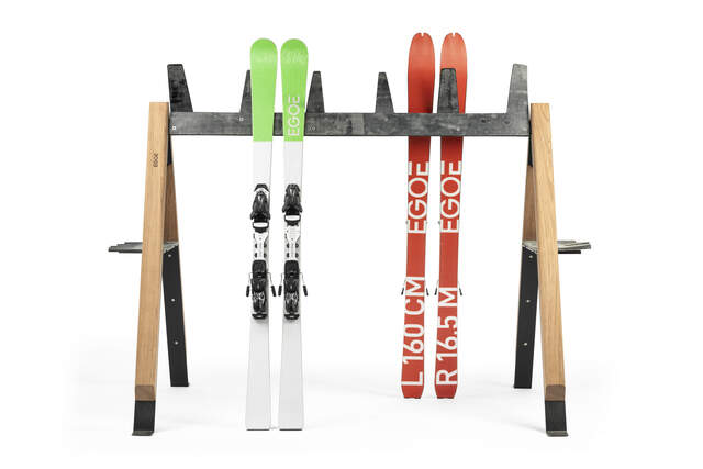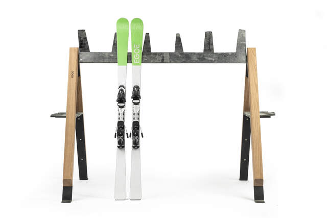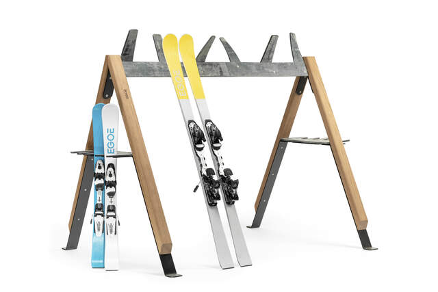 Multifunctional outdoor ski and bicycle rack with a rubber edge protector to safely lay equipment with the capacity up to 10 pairs of adult skis plus 8 pairs of kids' skis. During the cycling season, the rack can take up to 7 bicycles. The edge protector is carried by A-shaped legs made of solid wood. The rack can be anchored.
