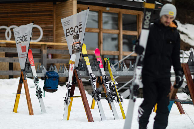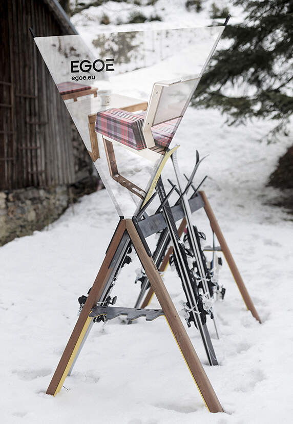 Multifunctional outdoor ski and bicycle rack with a rubber edge protector to safely lay equipment with the capacity up to 14 pairs of adult skis plus 8 pairs of kids' skis. During the cycling season, the rack can take up to 10 bicycles. The edge protector is carried by A-shaped legs made of solid wood. The rack can be anchored and is equipped with steel construction for placing an advertising banner.